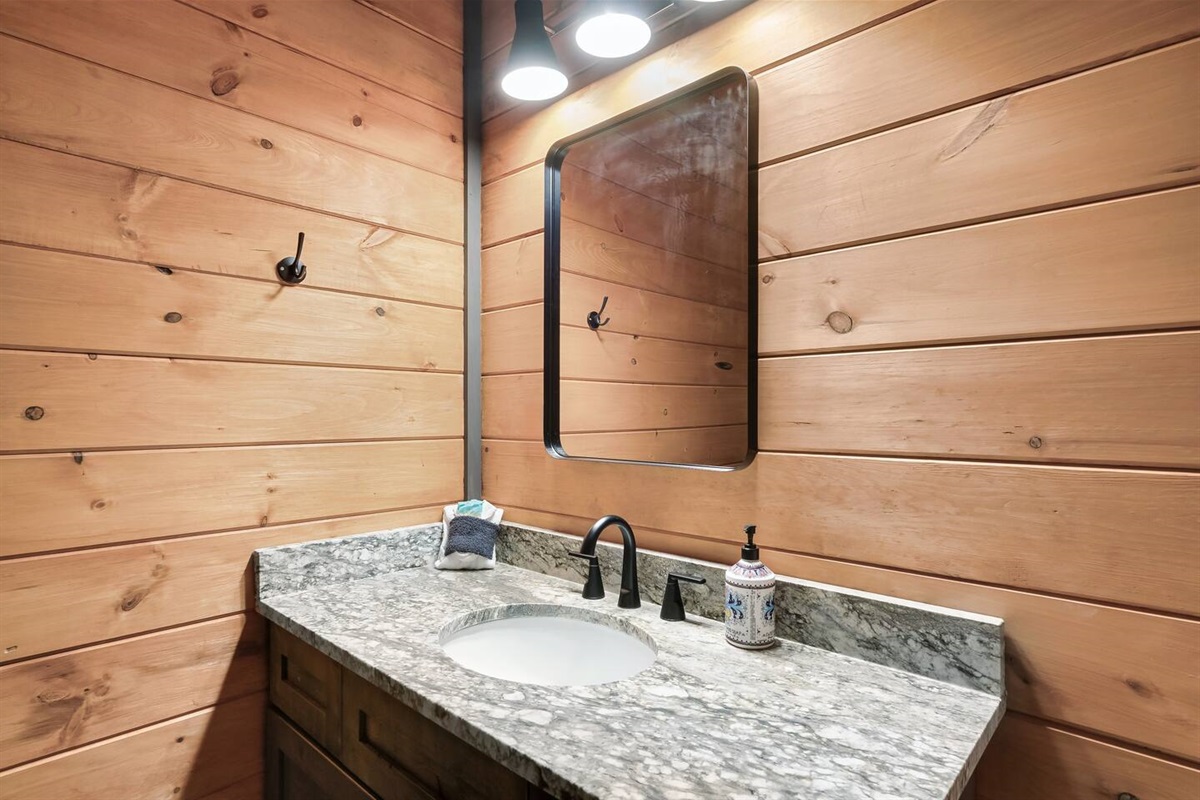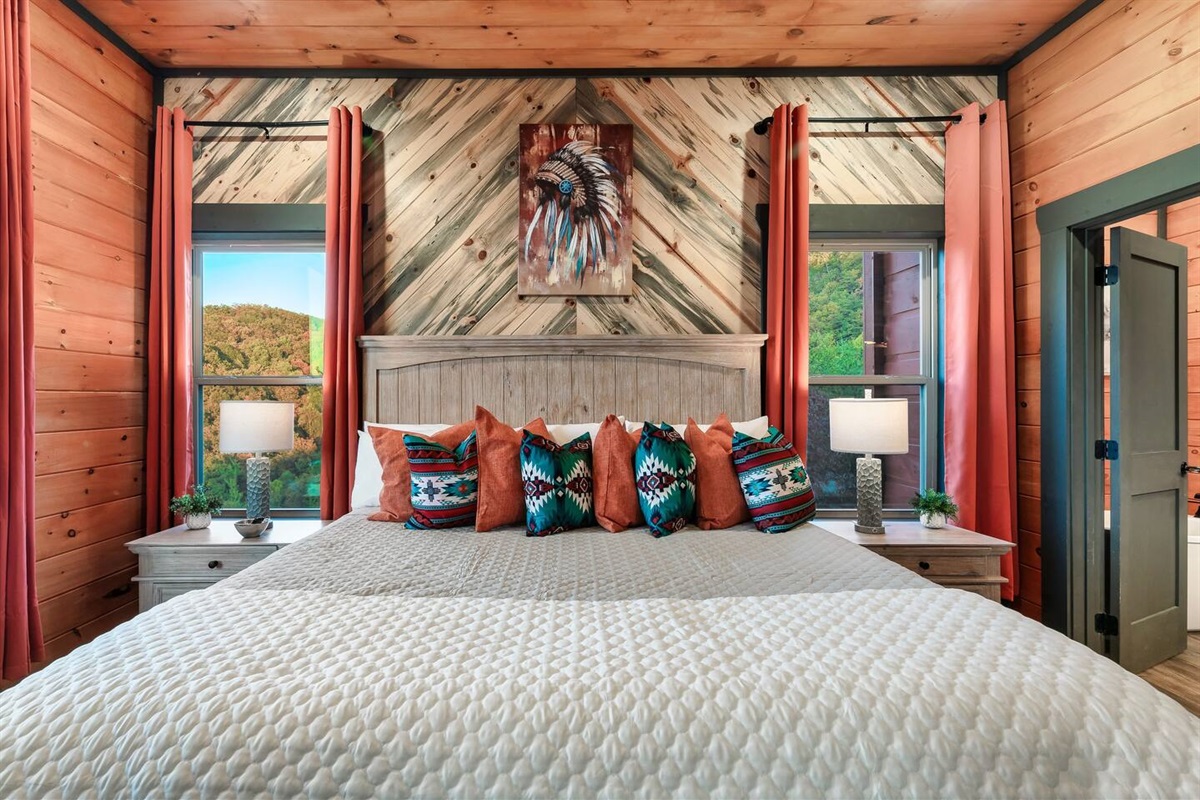 Upper Floor: 3 bedrooms—2 with king beds and 1 with two queen-over-queen log bunk beds, perfect for kids or groups.