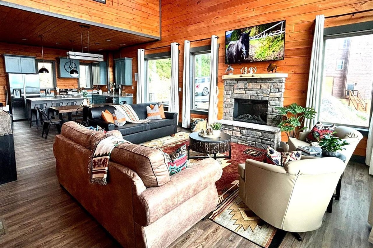 Upper Floor: 3 bedrooms—2 with king beds and 1 with two queen-over-queen log bunk beds, perfect for kids or groups.